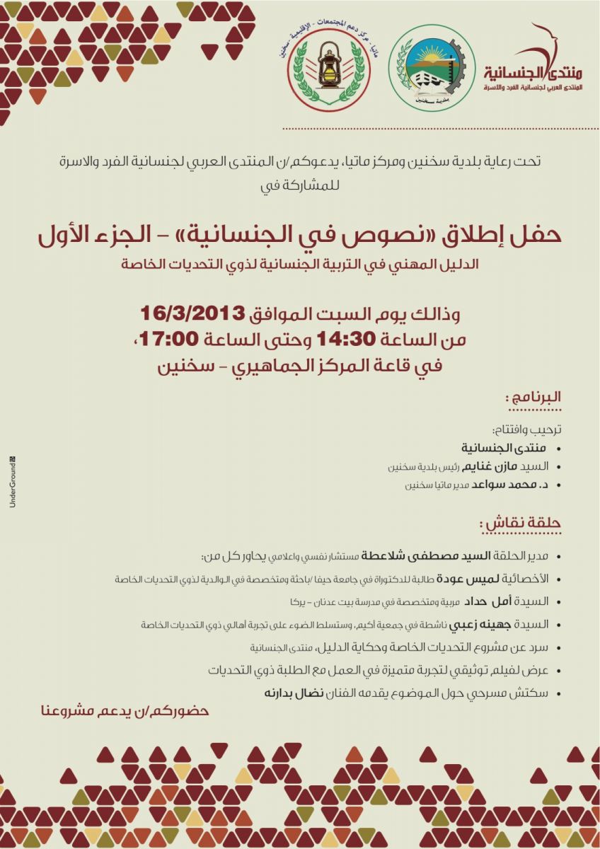 عمل المنتدى خلال السنتين الماضيتين على انتاج دليل مهني لمساعدة التربويين في العمل على مضامين التربية الجنسانية. لقد أنجزنا الجزء الأول من هذا الدليل، وهو متركز بذوي الإعاقات، وقد ارتأينا الإعلان عنه في حفل رسمي، سيكون يوم السبت الموافق 16/3/2013 في قاعة بلدية سخنين. من الجدير بالذكر بأننا تعاونا مع بلدية سخنين ومع مكتب "ماتيا" وسيعممون الدعوة على العديد من المتخصصين في العمل مع ذوي الإعاقات. مرفقة الدعوة الرسمية وأنوه بأن المداخلات ستكون على شكل طاولة حوار سيقوم بها مصطفى شلاعطة، كما وأن نضال بدارنة سيقدم عرضا مسرحيا كوميديا عن الموضوع. أتمنى مشاركتكمن معنا لأن حضوركم سيزيد من زخم الحدث وسيعزز من شرعية أهدافنا ورسالتنا المجتمعية كمنتدى جنسانية.